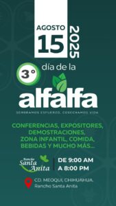 En Meoqui ya está todo listo para que este viernes 15 de agosto, se lleve a cabo la 3er edición del Día de la Alfalfa, evento que se convirtió en una tradición dentro del municipio, el cual contará con ponencias, música a cargo de “La Sonora de Sonoras” y “Los Gemelos Norteños”, comida y diversión para toda la familia, todo esto a partir de las 9 de la mañana en el Rancho Santa Anita, ubicado en la comunidad de Los Jaquéz.