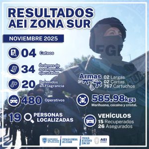 Derivado de las acciones de combate frontal de los delitos, la Agencia Estatal de Investigación (AEI), logró importantes resultados durante el mes de noviembre del presente año, en los municipios que comprenden la Fiscalía de Distrito Zona Sur.
