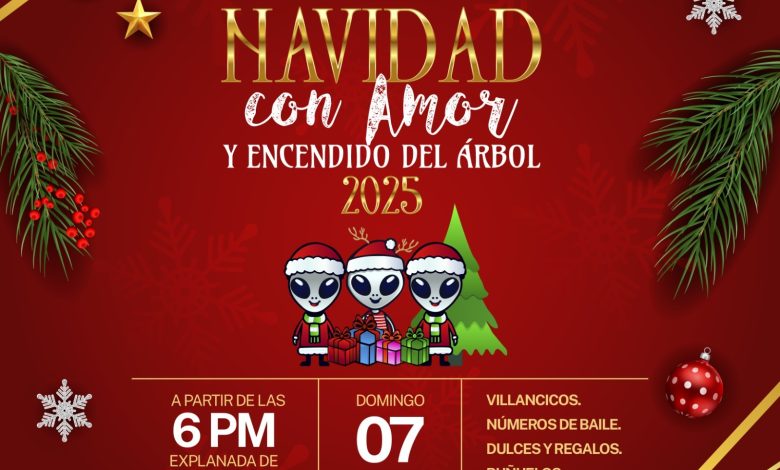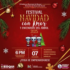 Este domingo 7 de diciembre, a partir de las 6 de la tarde en la Explanada de la Presidencia Municipal de Meoqui se llevará a cabo el Festival “Navidad con Amor”, con el tradicional encendido del árbol, donde habrá villancicos, números de baile, dulces, regalos, Feria de Emprendedores y muchas sorpresas para las familias.