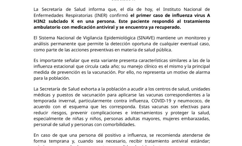 La Secretaría de Salud aclaró que la variante H3N2 subclado K es similar a la influenza estacional, la cual circula cada invierno, por ello, tiene el mismo manejo clínico.