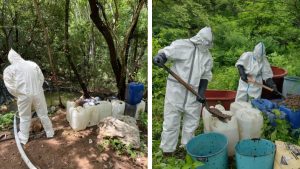 Durante las acciones, las autoridades aseguraron 1,600 litros de cloro, 1,400 litros de una sustancia con la leyenda “Colocid Brill Blue GS”, 1,260 litros de tolueno y 1,010 litros de alcohol etílico. También se localizaron 850 litros de una sustancia transparente desconocida y 680 litros de acetona.
