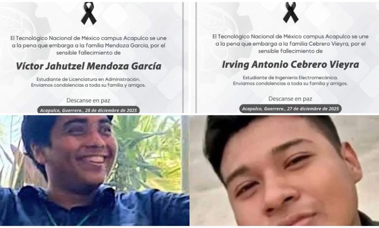 Este domingo, la institución educativa publicó esquelas en memoria de Irving Antonio Cebrero Vieyra y Víctor Jahutzel Mendoza García, estudiantes de la licenciatura en Administración y de Ingeniería Electromecánica.