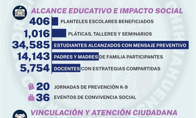 Un total de 34 mil 585 estudiantes en diversas partes de la entidad, desde preescolar hasta nivel medio superior, recibieron el mensaje preventivo e informativo del Grupo de Orientación Escolar Chihuahuense (GOECHI) de la Agencia Estatal de Investigación (AEI), durante el año 2025.
