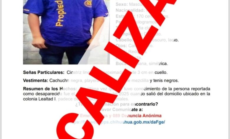 La Unidad de Investigación de Personas Ausentes y/o No Localizadas de la Fiscalía de Distrito Zona Centro (FDZC) concluyeron con la carpeta de investigación iniciada para dar con el paradero de Claudio Javier R. M., de 30 años de edad, quien tenían reporte de ausencia interpuesto el reporte interpuesto el 21 de diciembre de 2025, en la ciudad de Chihuahua.